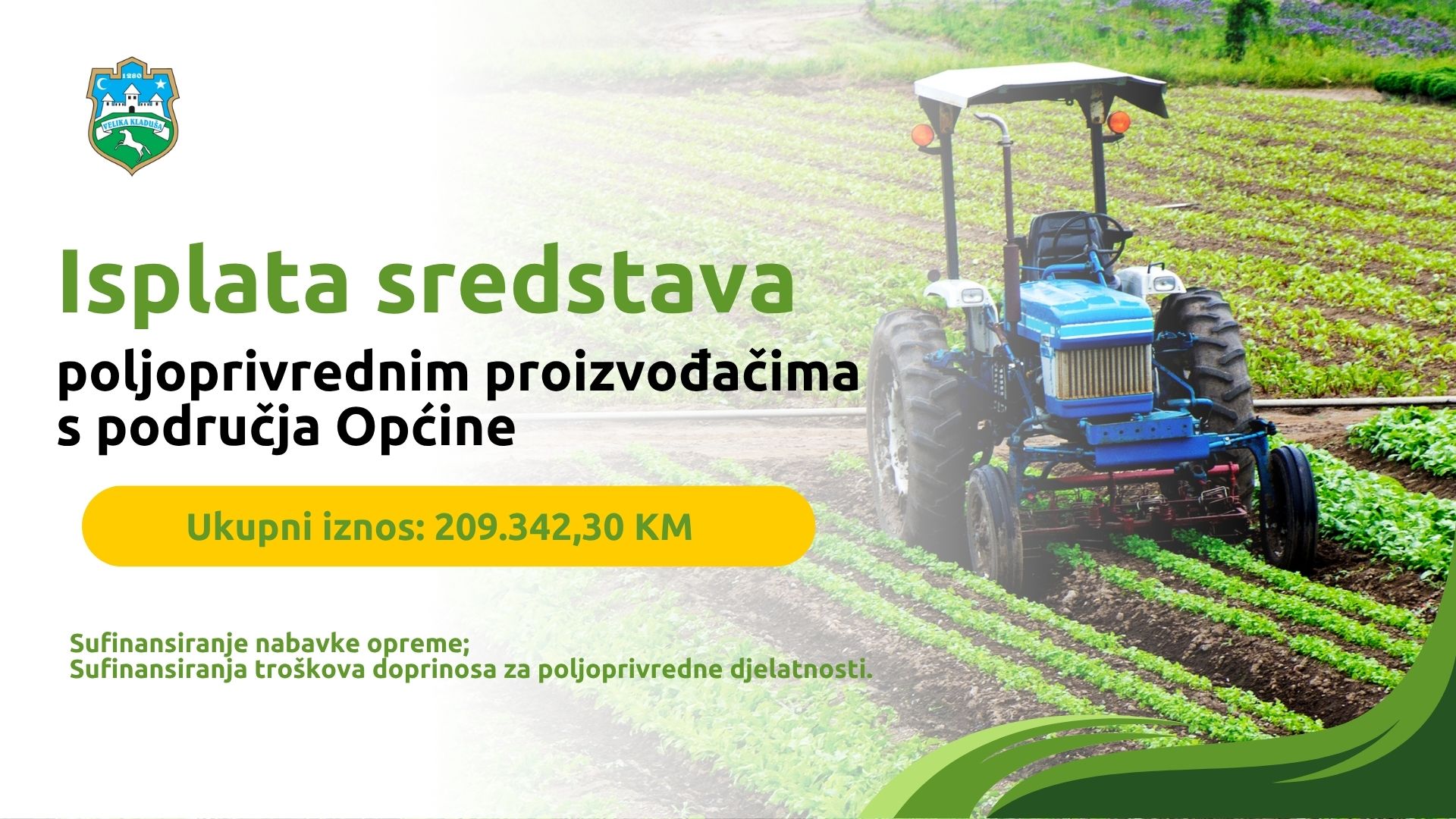 Općina Velika Kladuša izvršila je isplatu sredstava u ukupnom iznosu od 209.342,30 KM poljoprivrednim proizvođačima s područja općine.