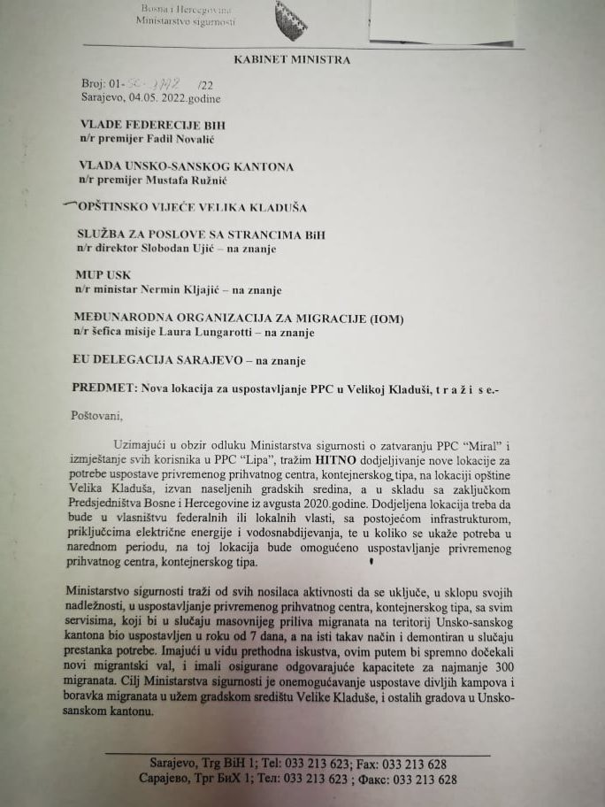 Nakon što je ministar sigurnosti BIH, Selmo Cikotić , 04. maja zatražio hitno dodijeljivanje nove lokacije za potrebe uspostave privremenog prihvatnog centra, kontejnerskog tipa, na lokaciji općine Velike Kladuša, zasjedao je Kolegij Općinskog vijeća, koji je još jednom potvrdio da Općina Velika Kladuša ostaje pri Zaključcima koji su doneseni na tematskim sjednicama, održanim 19.06.2018., 17.09.2020. i 09.06.2021. godine na temu migrantske krize.
