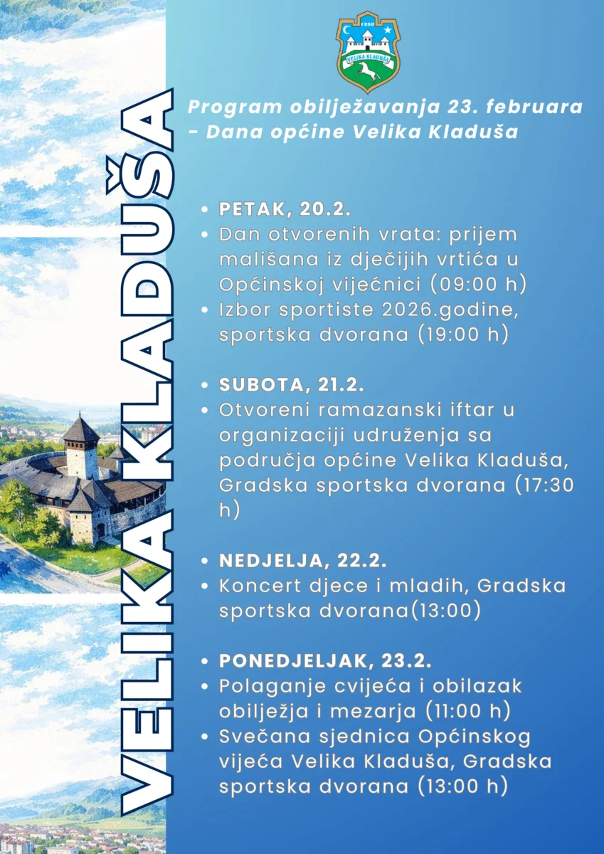 Prema programu koji je predložio Organizacioni odbor za obilježavanje 23. februara i usvojilo Općinsko vijeće, sadržaji počinju od petka 20. februara, kada je u jutarnjim satima planirano održavanje Dana otvorenih vrata odnosno prijem polaznika dječjih vrtića sa područja općine. Od 19h planirano je održavanje manifestacije Izbor sportiste godine općine Velika Kladuša za 2026. godinu.